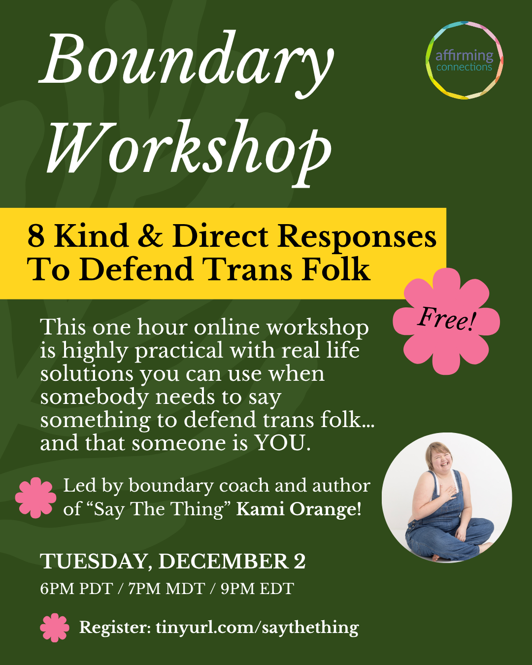 What if you’re at dinner with family and your Uncle James starts angrily ranting about pronouns? You’re uncomfortable. What’s being said is wrong. It goes against your values. You want to speak up and defend trans folk…but what words can you actually say? That’s what the Boundary Workshop is for.